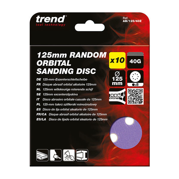 Trend 125mm 40 Grit Random Orbital Sanding Discs (10 Pack) is a high-performance, multi-material abrasive suitable for wood, paint, plastic, filler, plaster, and metal. Available in 40, 60, 80, 120, 150, 180, and 240G, ideal for paint removal, flattening, shaping, feathering, keying, denibbing & deburring.