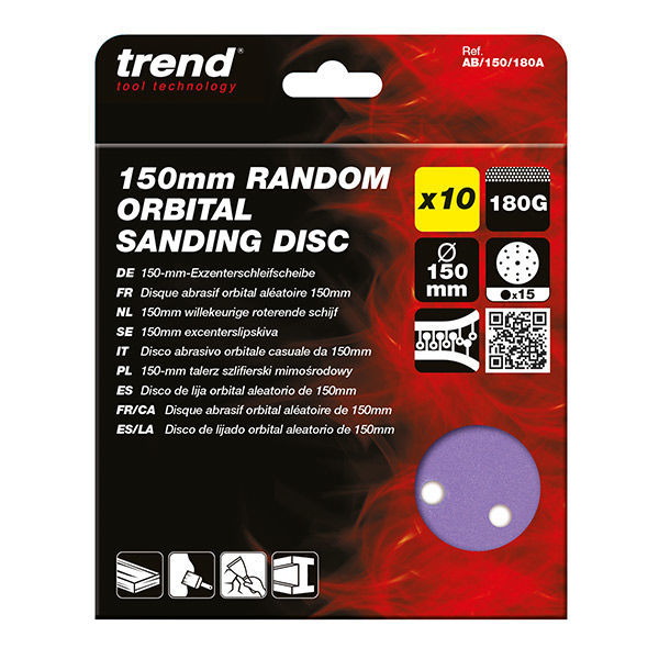 Trend 150mm 180 Grit Random Orbital Sanding Discs (10 Pack) is a high-performance, multi-material abrasive suitable for wood, paint, plastic, filler, plaster, and metal. Available in 40, 60, 80, 120, 150, 180, and 240G, ideal for paint removal, flattening, shaping, feathering, keying, denibbing & deburring.