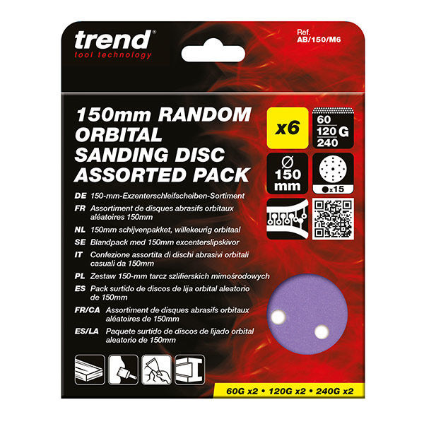 Trend 150mm 60G/120G/240G Random Orbital Sanding Discs (6 Pack) is a high-performance, multi-material abrasive suitable for wood, paint, plastic, filler, plaster, and metal. Available in 40, 60, 80, 120, 150, 180, and 240G, ideal for paint removal, flattening, shaping, feathering, keying, denibbing & deburring.