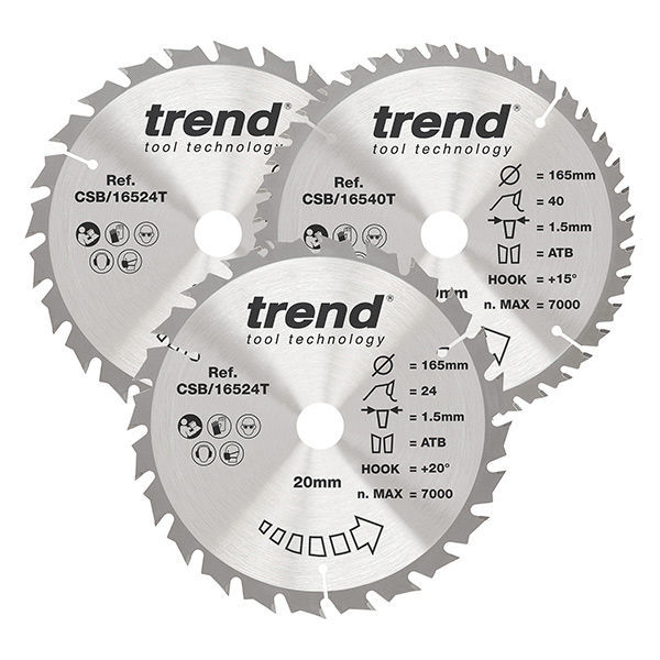 Trend Craft 165mm Diameter x 20mm x 24/40T Mixed Wood Saw Blades (3 Pack)is a range of tungsten carbide-tipped blades for wood and wood-based materials. For use in circular, plunge, and table saws, and available in a range of finishes. Ideal for ripping and trimming softwood, hardwood, plywood, MDF, and hardboard.